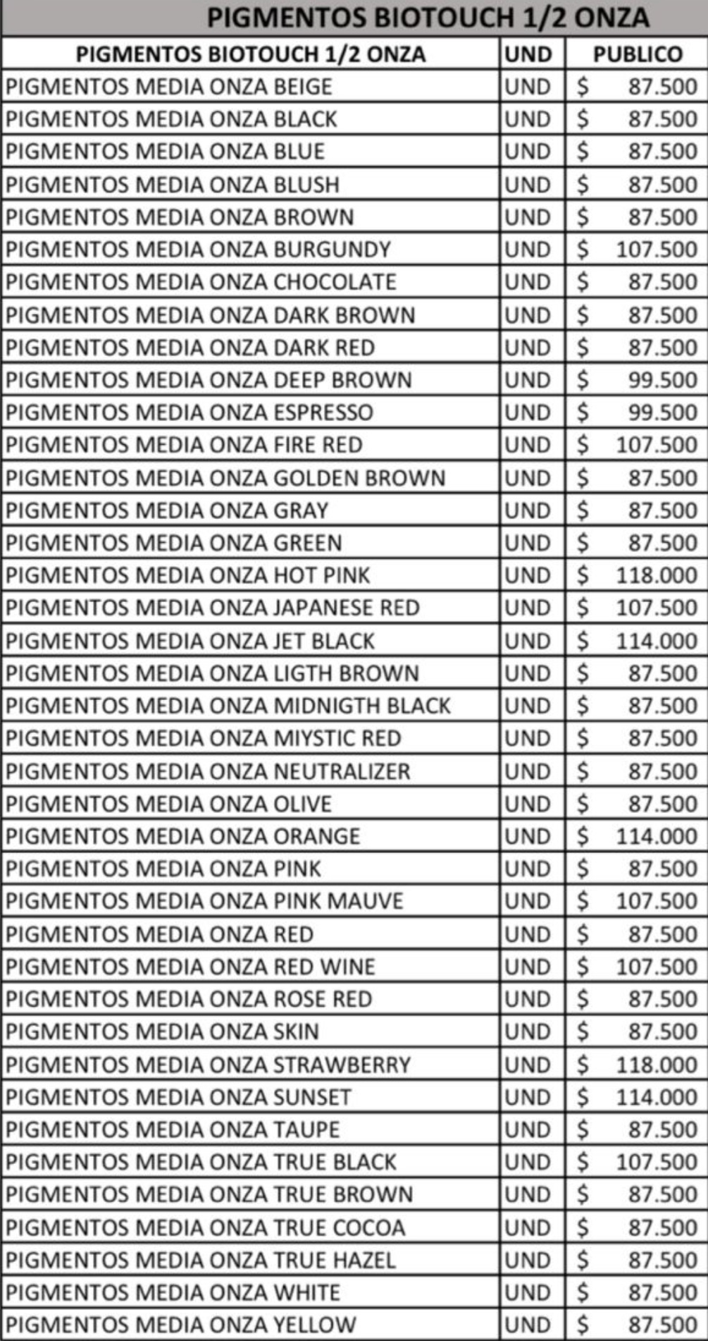 Pigmentos BIOTOUCH , Observa la carta de colores y pregunta por disponibilidad en el botón de WhatsApp que aparece en la página para brindarte asesoría, no realices el pago sin antes contactarte con un asesor para precios y disponibilidad.